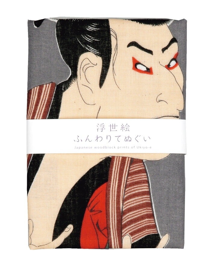 江戸時代に活躍した有名浮世絵師「写楽」の作品を、手拭いに描いた商品です。ふんわりとした肌触りや吸水性の良い、二重ガーゼ素材を使用。安心の日本製です。